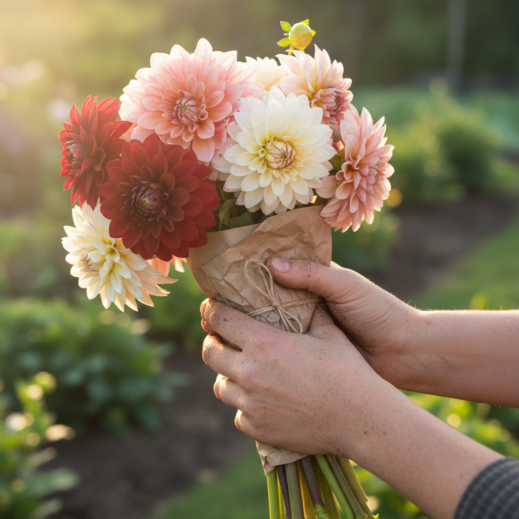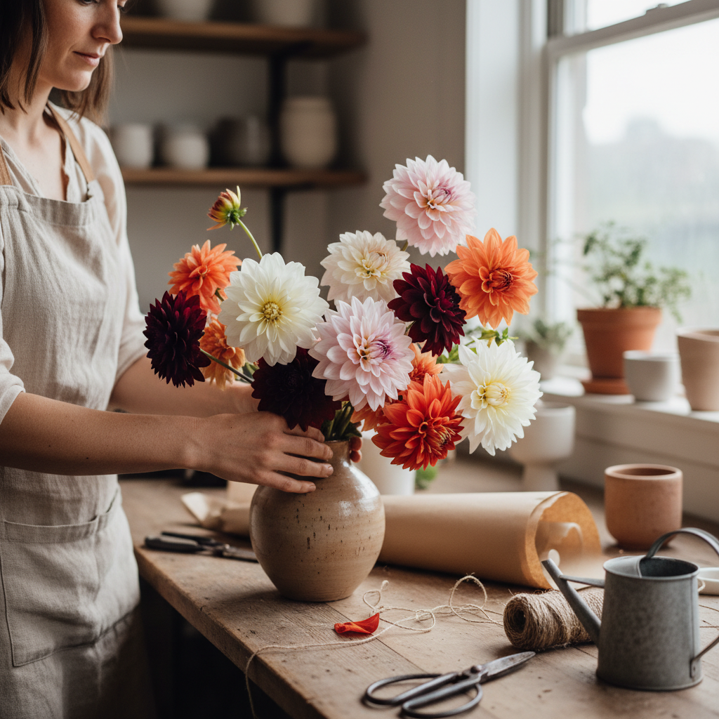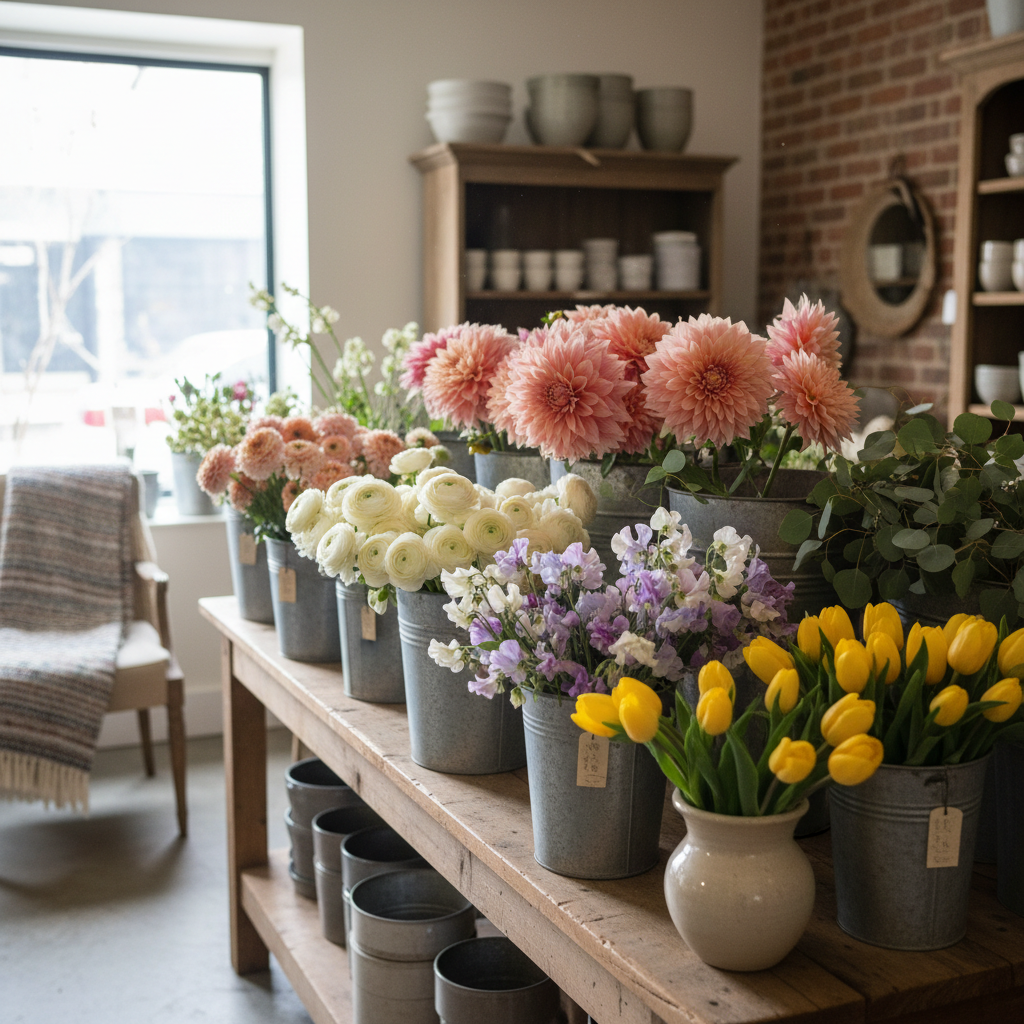 Single-variety buckets for retail display — dahlias by color family, ranunculus by tone, sweet peas by scent intensity. Your customers will ask where you got them.